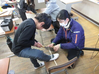 図画工作科の学習で、3年生がのこぎりを使って木を加工する活動に取り組みました。