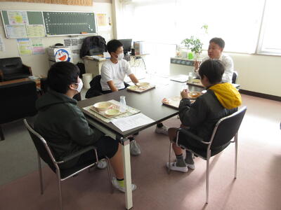 6年生3人ずつ校長室に来て、校長先生と話をしながら一緒に給食を食べます。